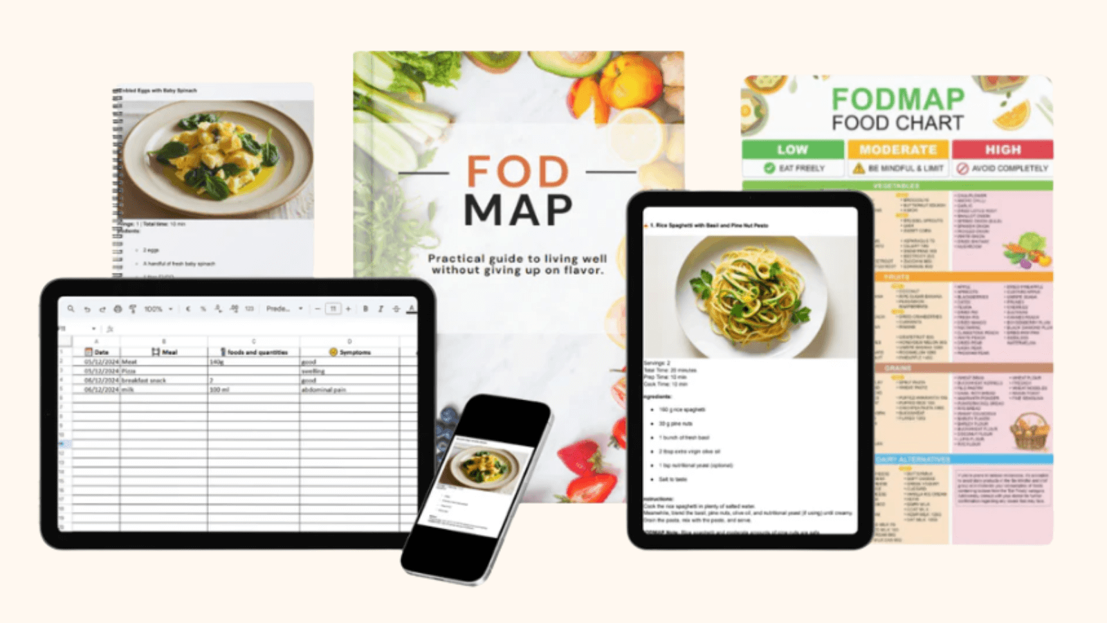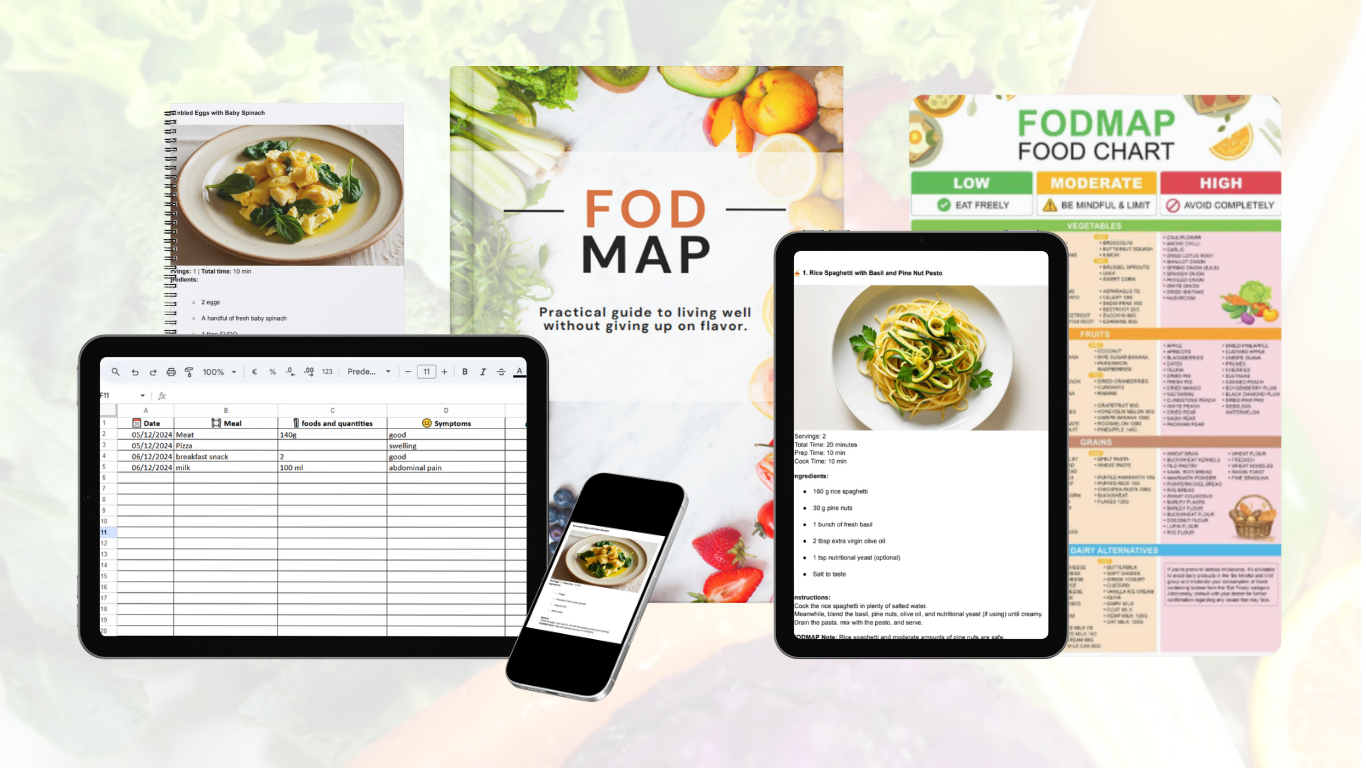 You’ll receive the complete FODMAP Guide, the Symptom Diary, a practical Shopping Guide, and a Starter Recipe Book with 20 tasty and balanced recipes. Everything you need to begin your journey safely, confidently, and with the right support.