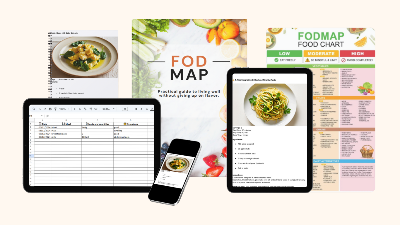 You’ll receive the complete FODMAP Guide, the Symptom Diary, a practical Shopping Guide, and a Starter Recipe Book with 20 tasty and balanced recipes. Everything you need to begin your journey safely, confidently, and with the right support.